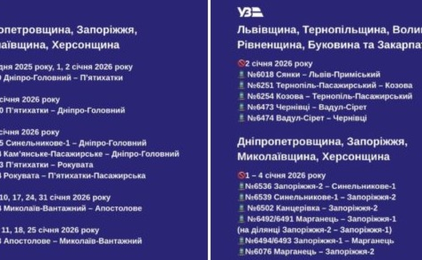У святкові дні на Дніпропетровщині частина поїздів тимчасово не курсуватиме.Більше новин на REPORTER.ua