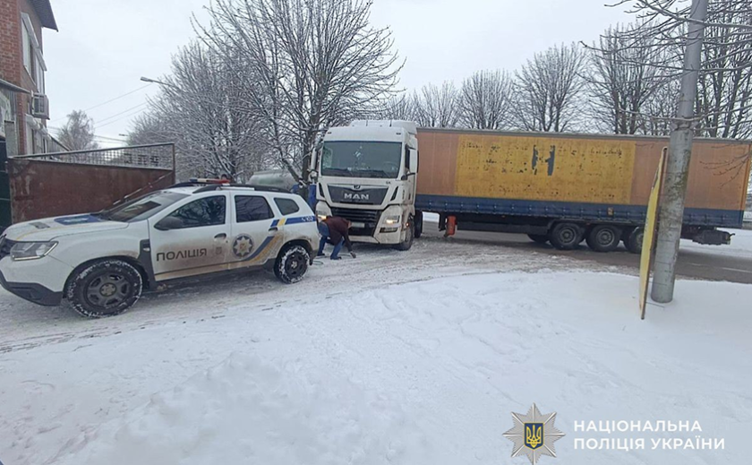Поліцейські офіцери громади Дніпропетровської області надають допомогу учасникам дорожнього руху в умовах складної погоди. Так, у Дніпровському районі через ожеледицю вантажний автомобіль з’їхав з проїзної частини на узбіччя та не зміг самостійно продовжити рух.